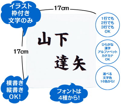 商品情報 商品名 お名前ゼッケン 「正方形 イラスト入り」 サイズ タテ17cm ヨコ17cm 素材 綿100% 白 表面 文字+イラスト+枠刺繍 横書きのみ対応、最大3行まで可能。