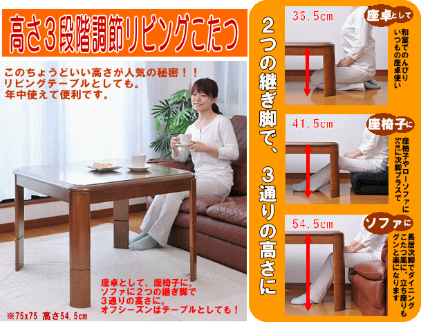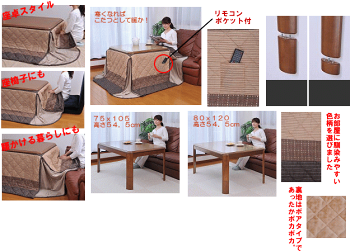高さが3段階に調節できるこたつシリーズ 本体のみ →75×75cmタイプ →75×105cmタイプ →80×120cmタイプ 本体+専用布団セット →75×75cmタイプ →75×105cmタイプ →80×120cmタイプ 本体+布団+高座椅子2脚セット →75×75cmタイプ →75×105cmタイプ →80×120cmタイプ 高座椅子のみはこちらから